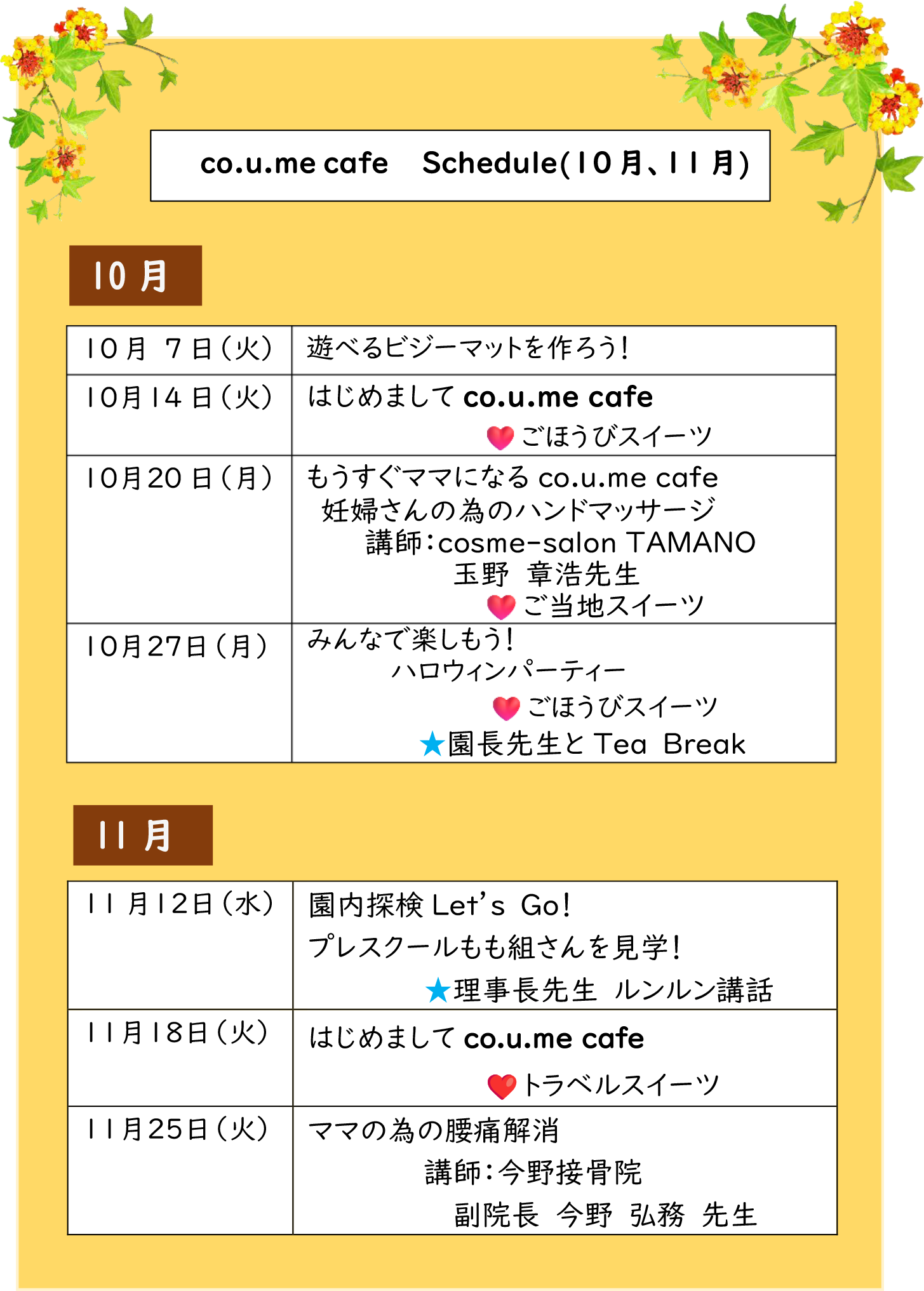 はじめましてのco.u.me cafe を 10月14日(火)、11月18日(火) に開催します |