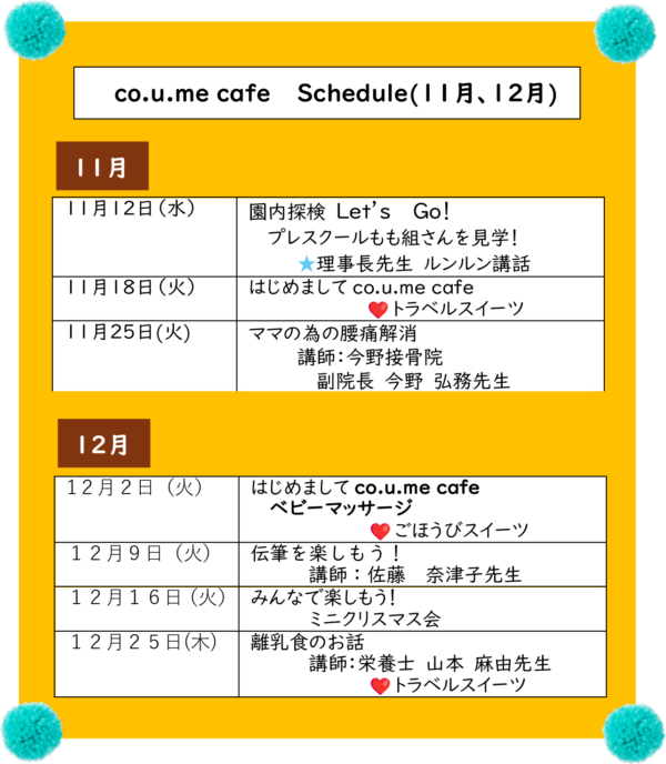 はじめましてのco.u.me cafe を 11月18日(火)、12月2日(火) に開催します 12月16日(火) は、クリスマス会を開催します |