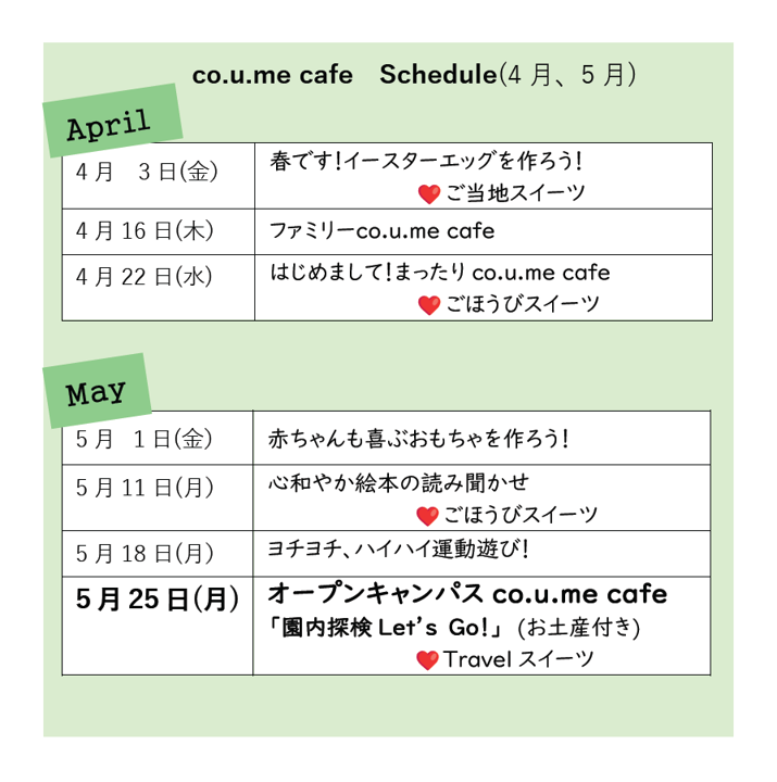 4・5月のスケジュールを更新いたしました! はじめましてのco.u.me cafeやオープンキャンパスなど、 様々なプチイベントをご用意しています。詳細はカレンダーをご覧ください。 |